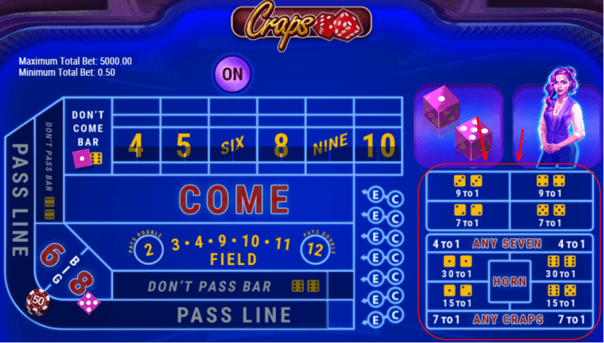 - “Any Craps”: يفوز اللاعب إذا كانت النتيجة 2، 3، أو 12.