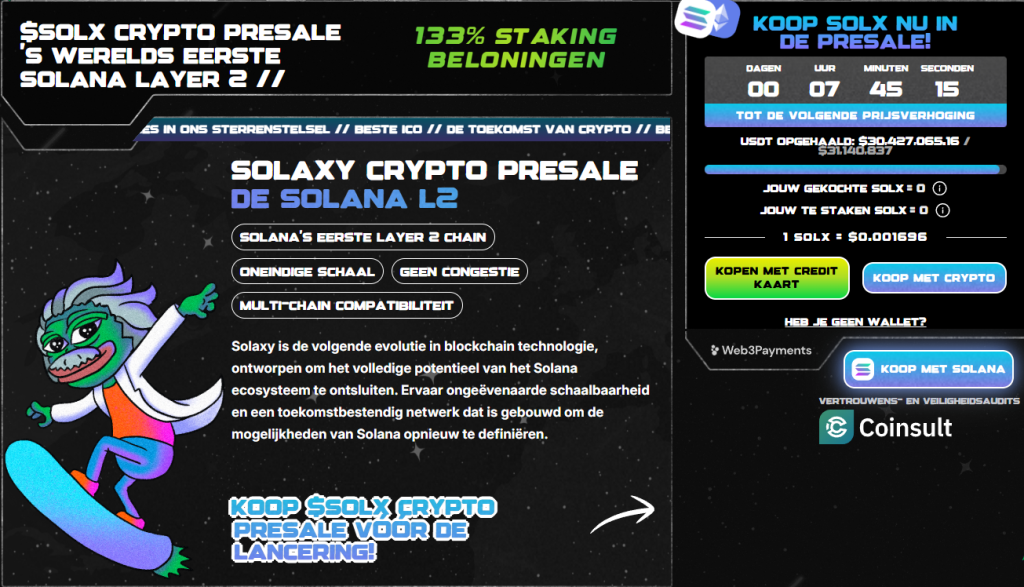 De presale loopt inmiddels als een trein: er is al meer dan $30 miljoen opgehaald. De prijs van een $SOLX token ligt momenteel op $0,001696, wat het heel interessant maakt voor wie er vroeg bij wil zijn.