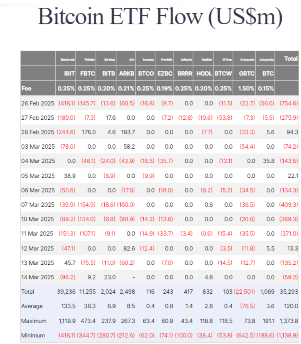 (Kapitalabflüsse bei Bitcoin – Quelle: https://farside.co.uk/btc/)