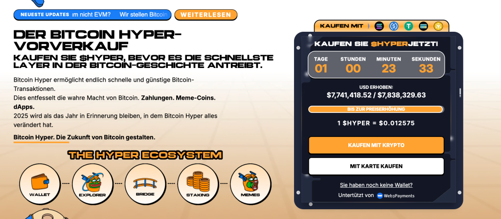 Sollte es Bitcoin Hyper gelingen, eine Brücke zwischen Bitcoin und modernen Blockchain-Anwendungen zu schlagen, könnte sich der Coin schnell zu einem der besten Altcoins des Jahres entwickeln. Analysten halten hier einen Kursanstieg von bis zu 5.000 % für möglich. Innerhalb kürzester Zeit haben Anleger schon Token im Wert von über 7,7 Millionen Dollar gekauft, sodass $HYPER nach dem Börsenlisting tatsächlich zu einem Milliarden Dollar Projekt aufsteigen könnte.