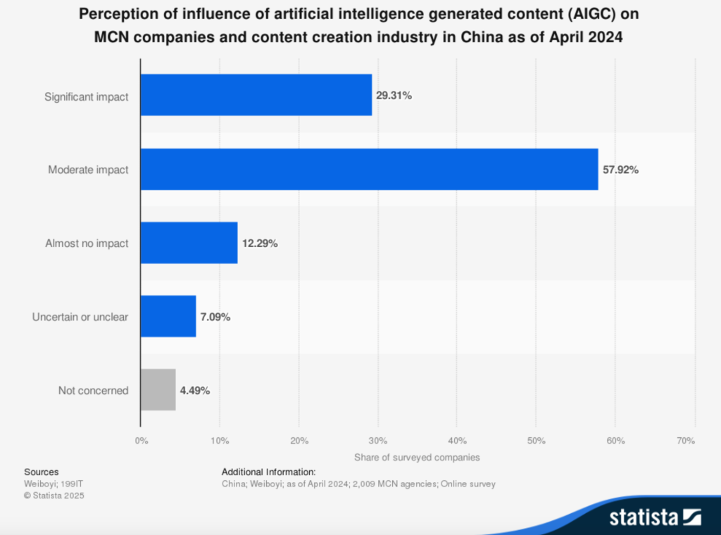 Der Daten- und Analyseanbieter Statista fand heraus, dass 87 % der Multi-Channel-Network-Unternehmen (für die YouTube ein typisches Beispiel ist) „der Ansicht sind, dass durch künstliche Intelligenz generierte Inhalte (AIGC) in naher Zukunft zumindest mäßige Auswirkungen auf ihre Unternehmen und die Branche der Online-Inhaltserstellung haben werden. Fast 30 Prozent der Befragten glaubten, dass KI eine große Rolle in der Branche spielen wird.“