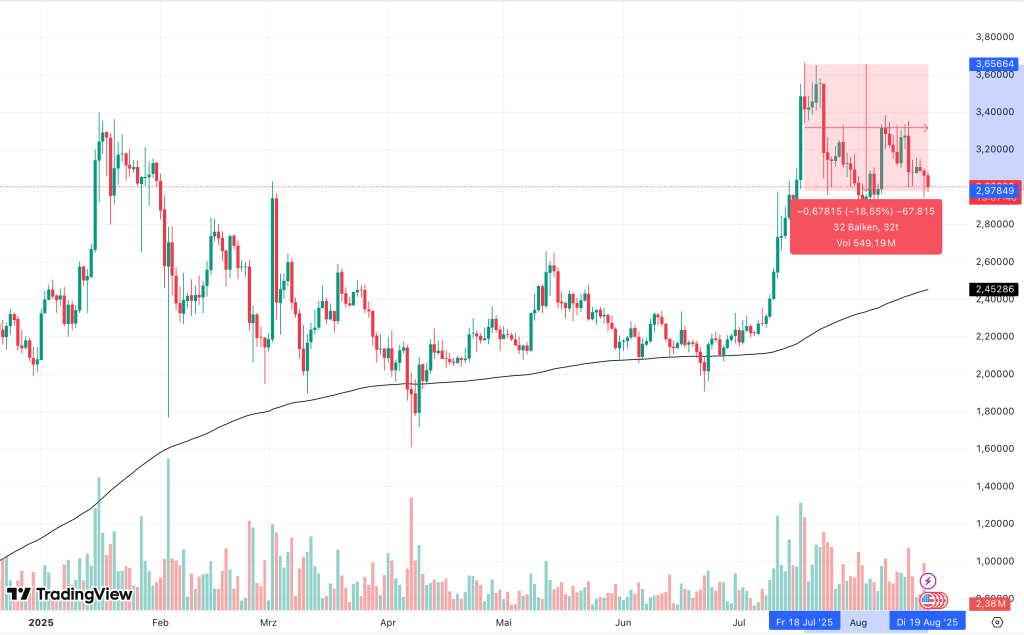 Zu lange hatten Investoren offenbar darauf gewartet, dass XRP ein ähnlich hohes Kursniveau erreicht wie in den großen Rallyes zuvor. Doch vom Hoch bei 3,65 Dollar ist der Coin bereits deutlich abgefallen. Inzwischen wurde auch die wichtige 3-Dollar-Marke nach unten durchbrochen. Damit summieren sich die Verluste seit Juli auf fast 20 %.