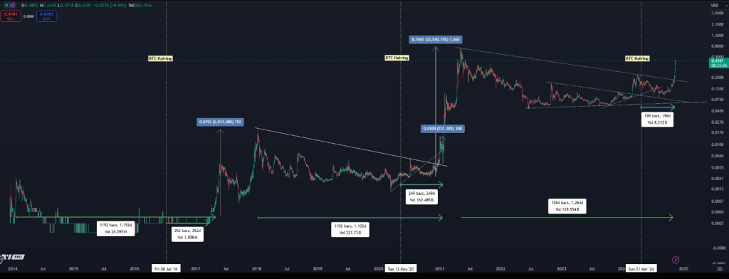 200+ days after each $BTC halving, DOGE made swift moves with massive multiples. Even the timing… pic.twitter.com/1iSINqSY3j