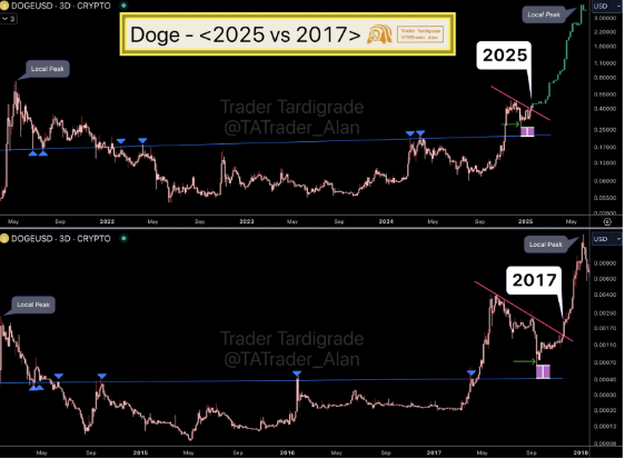 Tardigrade also drew parallels between Dogecoin’s current movement and its price action from 2017. He noted that Dogecoin has broken out from a consolidation trendline in a manner similar to a breakout before its rally in 2017. If history repeats itself, Dogecoin could reach a local peak above $3 in 2025.