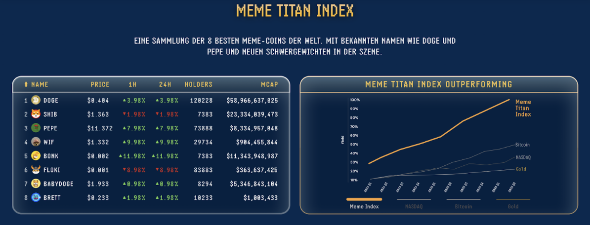 (Meme Titan Index agrupa las 8 mejores Meme-Coins, los otros Meme Indices agrupan monedas más pequeñas – Fuente: [memeindex.com](http://memeindex.com/))