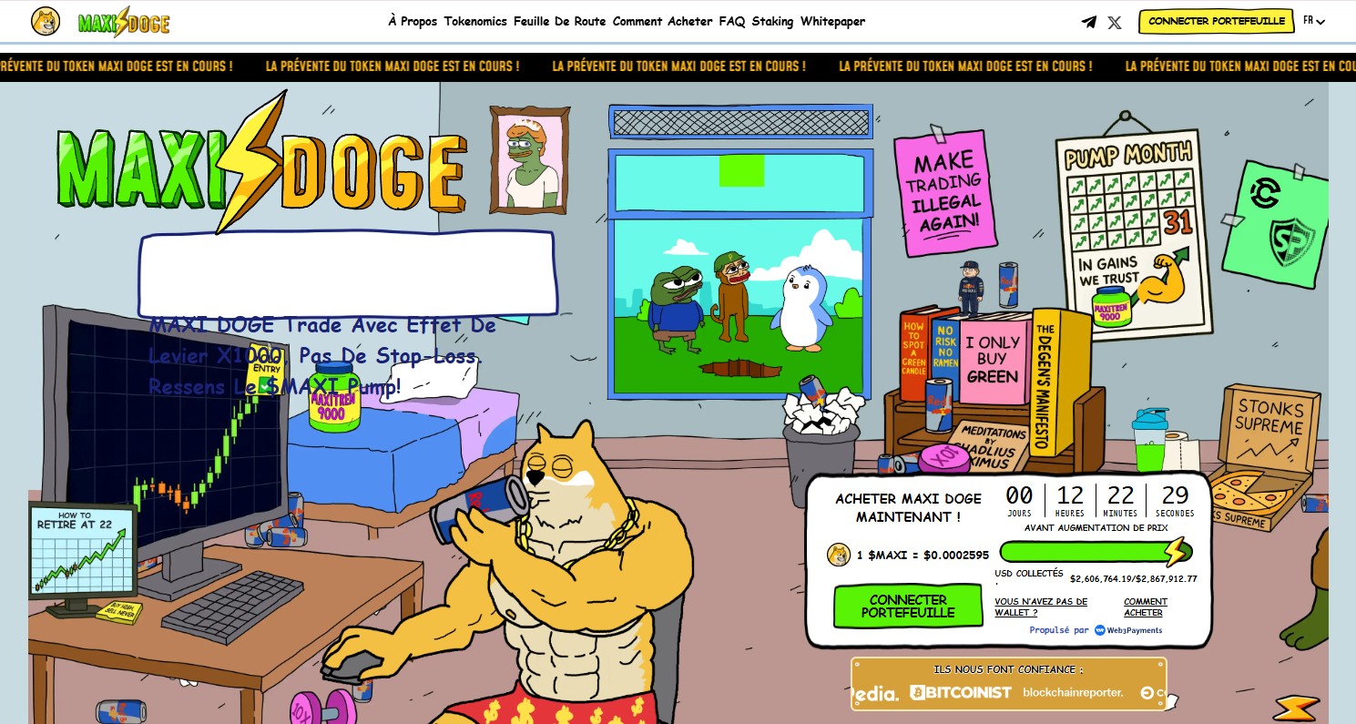 Maxi Doge es el primero. Ya se han recaudado más de 2,4 millones de dólares en una preventa explosiva. Aquí, estamos ante una identidad que juega a fondo la carta de la cultura meme. No es un gadget: en período de Altseason, las memecoins a menudo lideran la danza, alimentadas por la viralidad y la energía comunitaria.