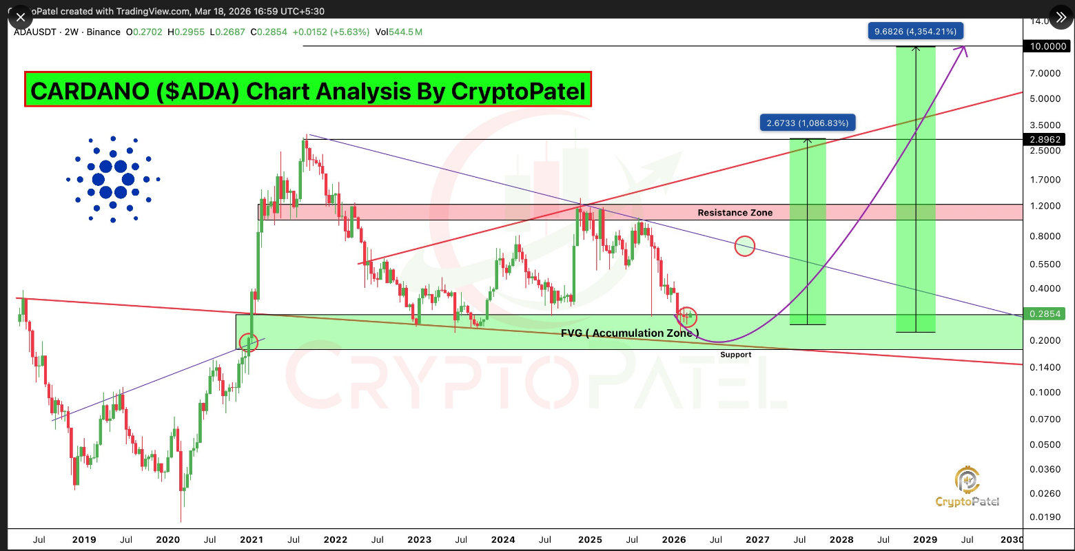 Cardano puede estar sentado en una de las oportunidades de compra más significativas de su historia, con analistas proyectando un posible rally del 1.000% si una zona de soporte de varios años continúa firme.