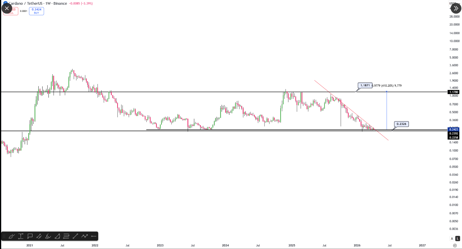 El caso técnico para un estallido se basa en una estructura que se ha estado construyendo desde principios de 2022. Según un gráfico compartido por el jefe de meme de Minswap DEX, Mintern en X, ADA ha estado operando dentro de un canal de precio horizontal durante aproximadamente cuatro años, reboteando entre un techo y un suelo sin romperse decididamente en ninguna dirección.