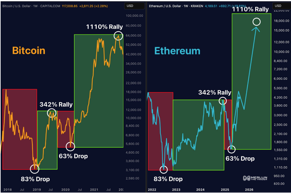 El gráfico semanal de Ethereum ha estado siguiendo la misma secuencia casi paso a paso en los últimos años. Después de una fuerte caída del 83% desde su pico de 2021, Ethereum montó un repunte del 342%, solo para experimentar un profundo retroceso de aproximadamente el 63% a $1,500 en abril de 2025. Desde entonces, sin embargo, Ethereum ha montado otro repunte, siendo la última movimiento el rally más reciente por encima de $4,200.