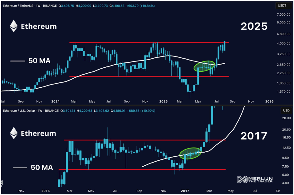 En otro análisis, Merlijn The Trader también señaló que el gráfico semanal de Ethereum está haciendo eco de su propia estructura de ruptura de 2017. En ese ciclo, Ethereum recuperó la media móvil de 50 semanas después de una prolongada fase de consolidación antes de entrar en un rally sostenido y poderoso. El gráfico de 2025 muestra una recuperación similar de la media móvil de 50, y el precio ahora está rompiendo por encima de la zona de resistencia de $4,000 que se ha mantenido desde marzo de 2024.