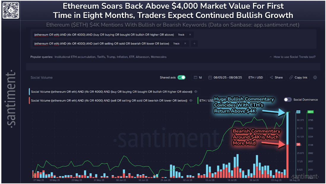 Aunque el reciente rally de precios de Ethereum se puede atribuir principalmente a las compras institucionales en los Spot Ethereum ETFs, la ruptura por encima de $4,000 no ha pasado desapercibida en el mercado en general. Notablemente, los datos de la plataforma de análisis on-chain Santiment reflejan un aumento dramático en la actividad alcista en los canales sociales.