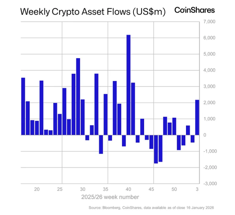Los informes dicen que los productos negociados en bolsa vinculados a criptomonedas a nivel global atrajeron alrededor de $2.2 mil millones en flujos netos de entrada durante la última semana, un salto que marcó el movimiento semanal más fuerte desde octubre del año pasado.