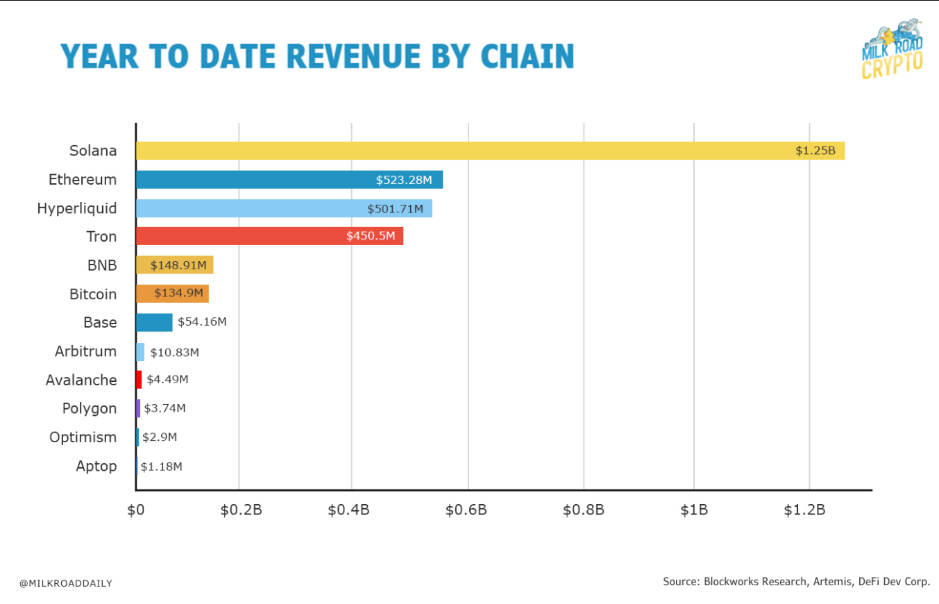 Según datos compartidos por los medios de comunicación criptográficos, Solana ha generado $1.25 mil millones en ingresos en lo que va del año. Eso es aproximadamente dos veces y media los ingresos de Ethereum, que se sitúa en $523 millones en lo que va de este año.