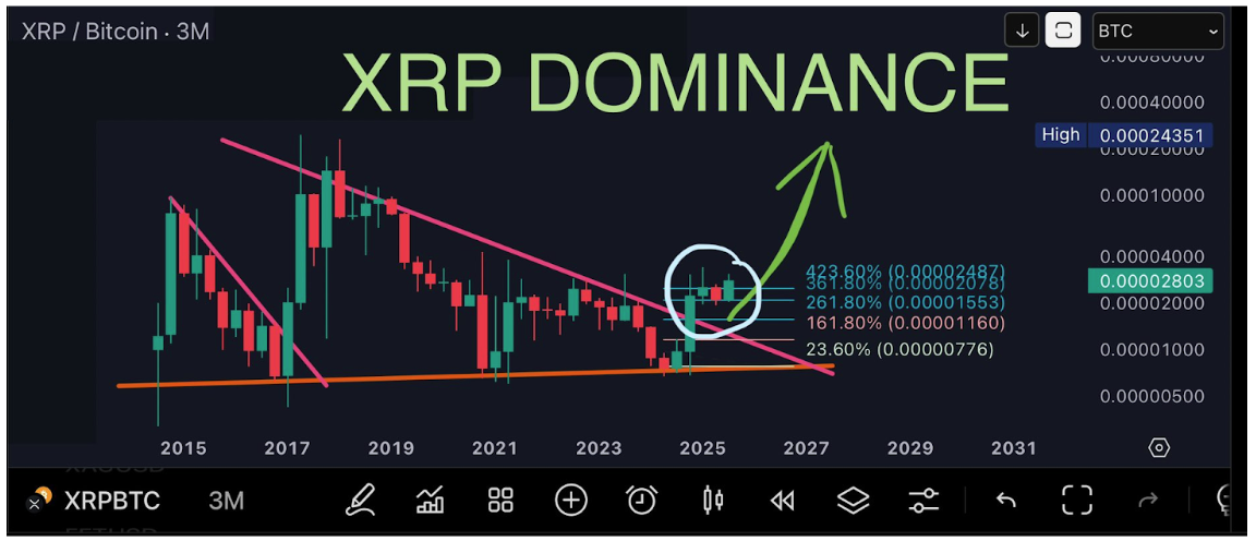 Según un desglose de el par XRP/BTC del analista de criptomonedas Dark Defender en la plataforma de redes sociales X, XRP ha superado en gran medida a Bitcoin desde finales de 2024 y principios de 2025. Esta tendencia se muestra en el gráfico de precios de velas de 3 meses de XRP/BTC a continuación, que captura una ruptura decisiva por encima de una línea de tendencia de resistencia a la baja de larga data en diciembre de 2024.