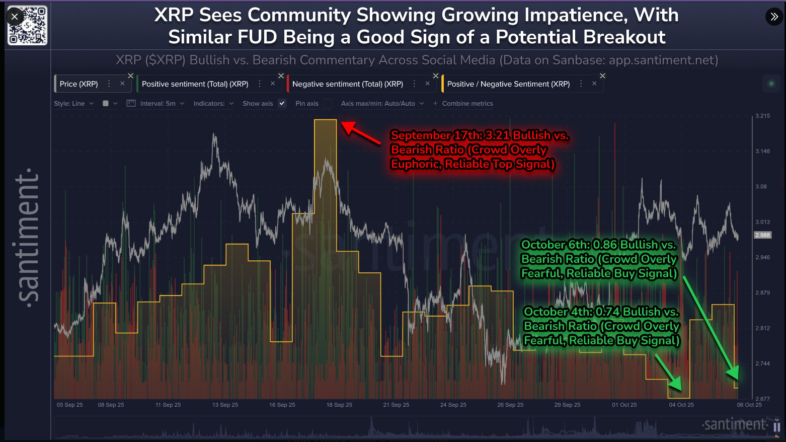 Según Santiment, XRP está experimentando su mayor nivel de miedo, incertidumbre y duda minorista en seis meses. Esa oleada de negatividad es interpretada por algunos analistas como una señal contraria: el miedo en la calle podría llegar justo antes de un cambio de rumbo.