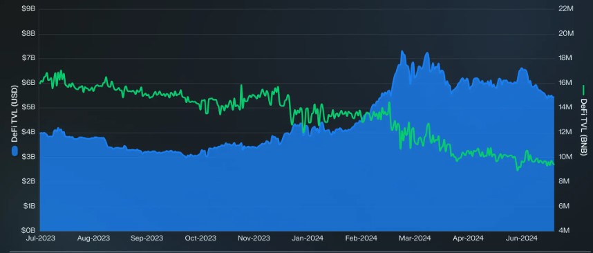 La empresa señala que esto indica que el descenso general de valor bloqueado se debió en parte a la caída del valor del token BNB, que cerró el trimestre en un mínimo de 567 dólares después de alcanzar un máximo histórico de 722 dólares en marzo.