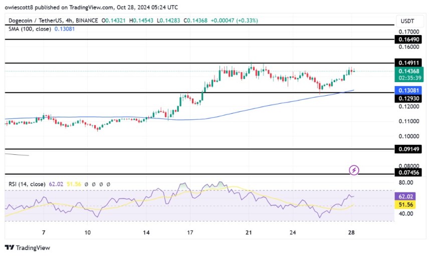 Tras la reciente recuperación* en 0,1293 dólares, el precio del DOGE en el gráfico de 4 horas ha seguido ganando presión, acercándose a 0,1491 dólares con el objetivo de superarlo. DOGE también se está negociando por encima de la media móvil simple (SMA) de 100 días, lo que sugiere una tendencia alcista positiva que podría conducir a una posible ruptura.