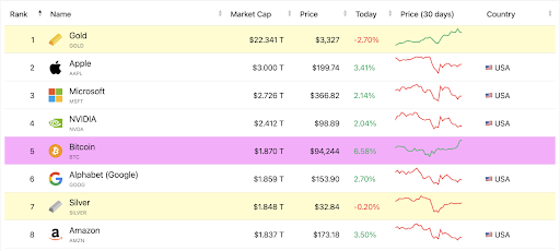 Las entradas de los ETF encendieron la chispa y la reacción resultante del mercado impulsó el ascenso de Bitcoin en las clasificaciones mundiales. Según datos de CompaniesMarketCap, el valor total de mercado de Bitcoin subió a más de $1.87 billones al cruzar los $94,000 por primera vez en ocho semanas.