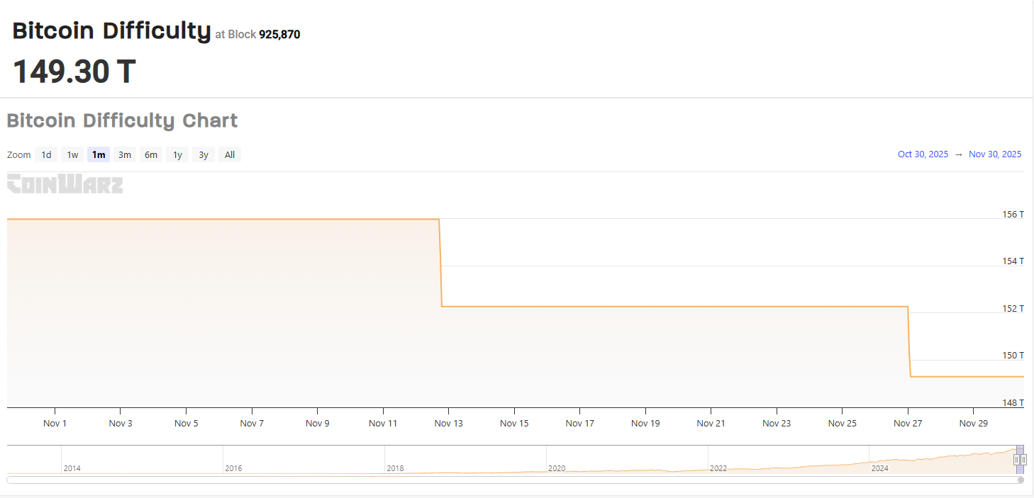 Según CoinWarz, el próximo ajuste de dificultad se espera en el bloque 927.360, moviendo el objetivo de 149 billones a cerca de 150 billones. Ese es un aumento modesto, pero importa porque los mineros de Bitcoin ya están trabajando con márgenes muy ajustados. El hashpower es lo suficientemente fuerte como para aumentar la dificultad, incluso mientras los rendimientos se mantienen cerca de mínimos históricos.