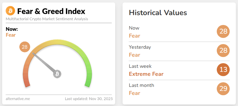 Según el Crypto Fear & Greed Index, el sentimiento recientemente subió a 20, saliendo de "Miedo Extremo" después de una racha de lecturas bajas. El índice había alcanzado un mínimo anual de 10 el 22 de noviembre y el mercado había pasado dieciocho días estancado en el miedo extremo.