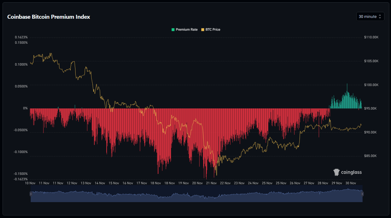 Los datos de Coinglass del día 30 mostraron la prima en 0,0255%, lo que marcó la primera lectura positiva en 29 días. Durante casi un mes, la prima negativa había sugerido que la presión de venta dominaba el mercado estadounidense, y los operadores e inversores se inclinaban por la cautela.