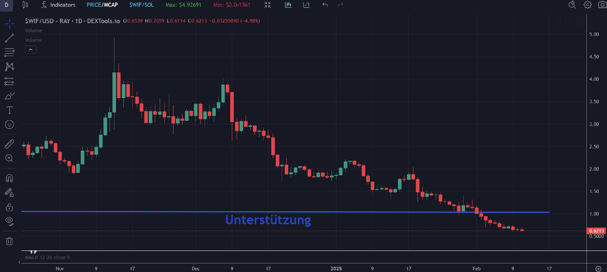 En 1,03 dólares se situaba una fuerte línea de soporte. Sin embargo, esta se vio superada el 2 de febrero. Desde entonces, el precio de esta criptomoneda meme ha caído un 40 por ciento más. $WIF, antaño una de las criptomonedas meme más importantes, se encuentra ahora al borde del crash.