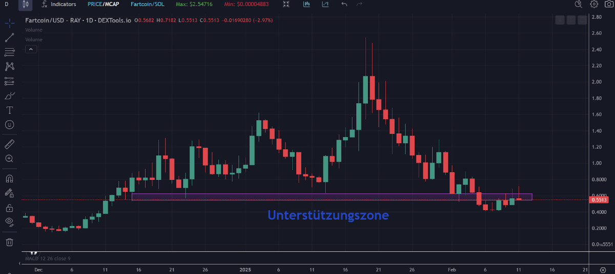 La situación de $FARTCOIN no es tan delicada, pero tampoco es buena ni mucho menos. A diferencia de $WIF, esta criptomoneda ha logrado beneficiarse del último repunte, aunque también ha experimentado una fuerte caída. El último máximo histórico de $FARTCOIN se registró el 20 de enero de este año a un precio de 2,61 dólares. Desde entonces, su precio ha caído más de un 78 por ciento y, en la actualidad, también cotiza en una importante zona de soporte.
