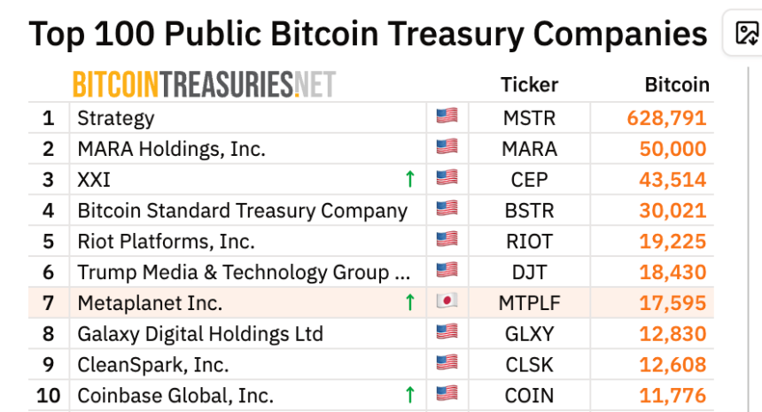 La empresa "Metaplanet" añadió un total de 463 unidades de $BTC a su cartera de activos, pagando un precio medio de 119.500 dólares por cada Bitcoin. Ahora, esta empresa se encuentra entre los mayores tenedores corporativos de Bitcoin del mundo, y está sólo un puesto por debajo de empresas como "Strategy".