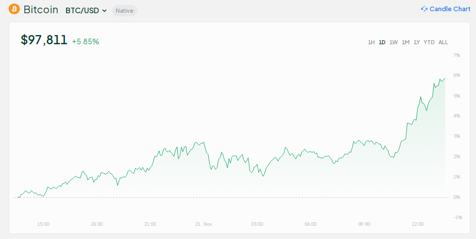 Bitcoin continúa su aumento de precios este jueves, alcanzando un nuevo máximo histórico de 97.000 dólares durante las operaciones intradía. El precio del activo se disparó un 5,7%, alcanzando los 97.811 dólares en Bitstamp, aumentando su capitalización de mercado a 1,93 billones de dólares.