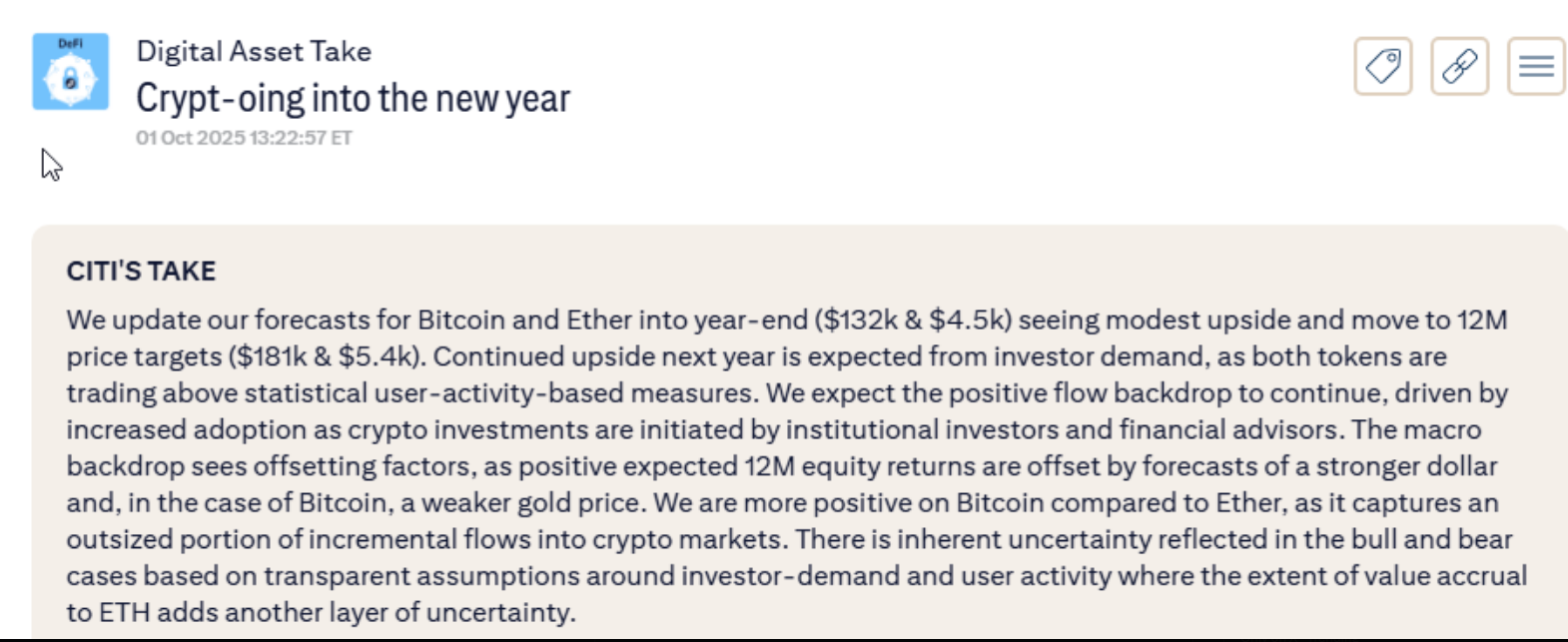 La nota también comparó estos objetivos con las llamadas de fin de año anteriores de Citi — $132,000 para Bitcoin y $4,500 para Ethereum — y dijo que extendió el plazo a un horizonte de 12 meses que llega hasta octubre de 2026.