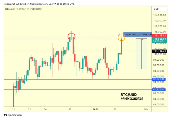 Hasta entonces, Rekt Capital mencionó que Bitcoin continuaría oscilando entre $ 101,000 y $ 106,000. El analista de criptomonedas Titan of Crypto ofreció una perspectiva más optimista para BTC, afirmando que la criptografía insignia ha comenzado su repunte. Comentó que, como se anticipó, la criptografía ha superado la resistencia y ahora está preparada para un fuerte repunte.