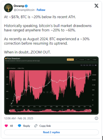 Глава CryptoQuant Ки Янг Джу отмечает, что в 2021 году BTC уже сталкивался с 53%-м обвалом, но это не помешало ему затем достичь новых ценовых максимумов. По его мнению, 30%-я коррекция — стандартное явление в бычьем рынке, и паника здесь неуместна.