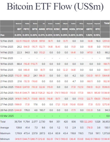 Тем не менее одним из факторов, повлиявших на позитивный тренд монеты в начале марта, стало поступление крупных инвестиций в Bitcoin-ETF. 28 февраля серия оттоков прекратилась, и трейдеры внесли $93,4 млн, что укрепило позиции Биткоина. По данным Farside Investors, этот тренд продолжается.