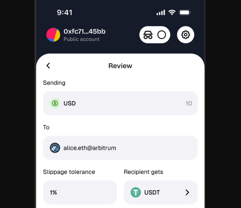 Por ejemplo, cuando un usuario intenta enviar fondos, mostrará una dirección como "alice.eth@arbitrum", que muestra claramente que Arbitrum es la red de destino, o "bob.eth@zksync", donde zkSync es inequívocamente la cadena de destino.