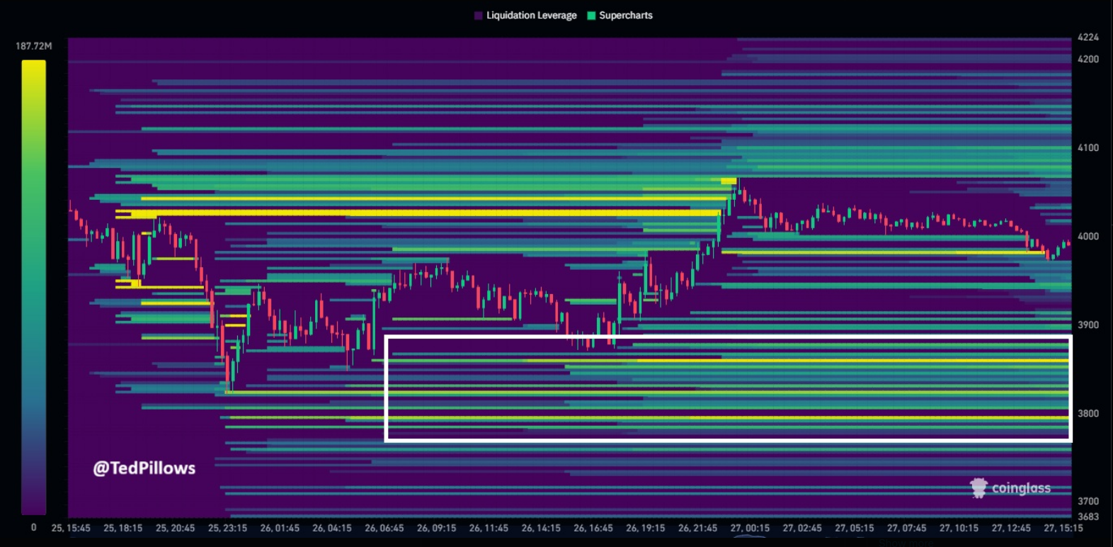 El analista de criptomonedas Ted Pillows advirtió que la zona de $3,700 a $3,800 podría enfrentar una fuerte presión. Los informes señalan que si ETH cae por debajo de $3,700, muchas posiciones de margen podrían ser eliminadas y desencadenar ventas forzadas que empujen los precios a la baja.