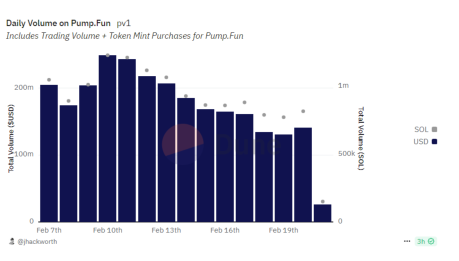 El fiasco con $LIBRA fue la gota que colmó el vaso para muchos inversores. Como resultado, el volumen de operaciones en la plataforma Pump.fun, especializada en el lanzamiento de nuevos memecoins, cayó de 249 millones de dólares a 141 millones de dólares en una semana.