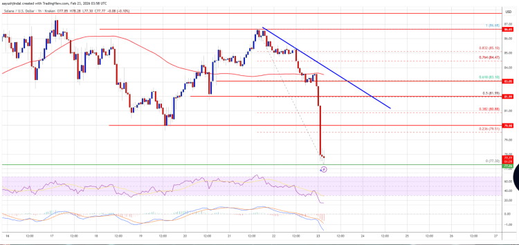 Solana se cotiza ahora bajo los 80$ y la media móvil simple a 100 horas. Hacia arriba, la resistencia inmediata se encuentra cerca del nivel de 80$. La siguiente resistencia principal se encuentra cerca de los 82$, es decir, en el nivel de retracción de Fibonacci del 50% del movimiento descendente desde el máximo de 86,68$ hasta el mínimo de 77,30$. En el gráfico por hora de la pareja SOL/USD también se ha formado una línea de tendencia bajista clave con resistencia en 82$.