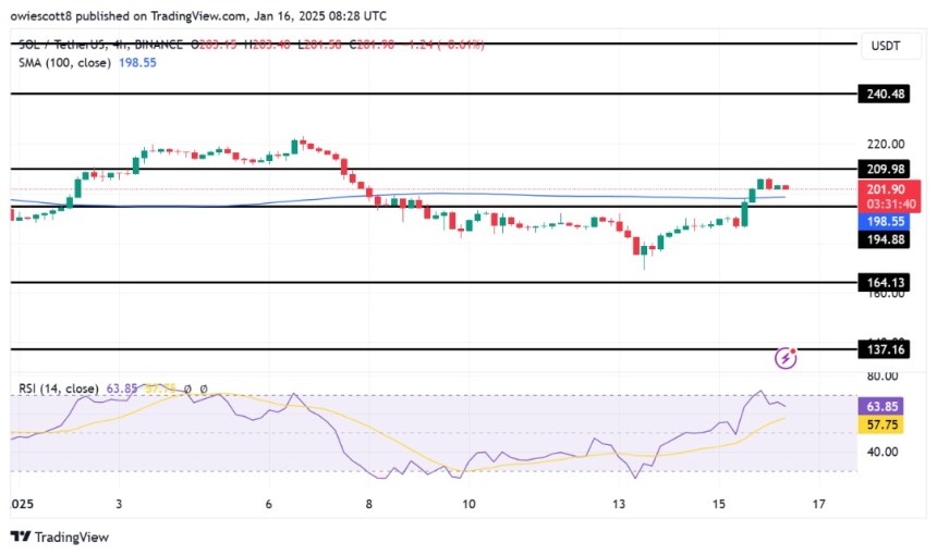 La acción del precio de Solana ha tomado un giro alcista, con la criptomoneda recuperando el promedio móvil simple (SMA) crítico de 4 horas y poniendo su mira en el nivel de resistencia de 209 dólares. Esta recuperación refleja un renovado interés de compra y un creciente [optimismo](https://www.newsbtc.com/news/solana-nears-210-etf-approval-hopes-spark-optimism-in-the-crypto-market/) entre los operadores a medida que SOL se recupera de una reciente consolidación.
