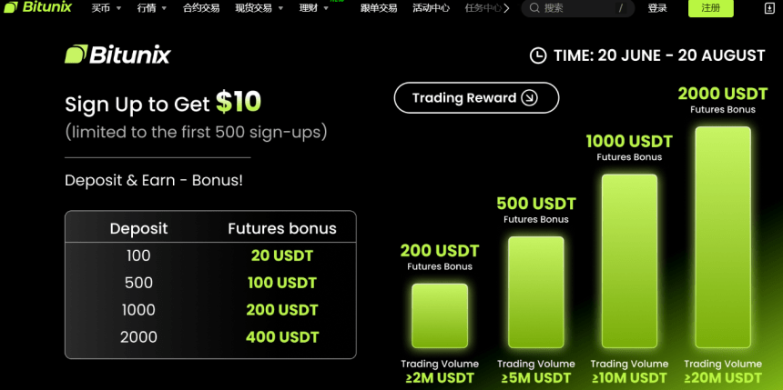 在這段限時期間,您可透過註冊獎勵、首筆入金回饋與交易量獎金等多重機制,全面提升資金效益。無論您是剛進場的新手,或是活躍操作的老手,都能在Bitunix簡單上手、快速賺取USDT,讓交易資金即刻放大,穩穩掌握加密市場的每一波機會!