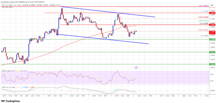 El precio de XRP extendió sus ganancias más allá de los 3,00 $ y 3,05 $ antes de corregir ligeramente a la baja. Ahora, el token está consolidando ganancias y enfrenta una resistencia clave en el área de **3,05 $**.
