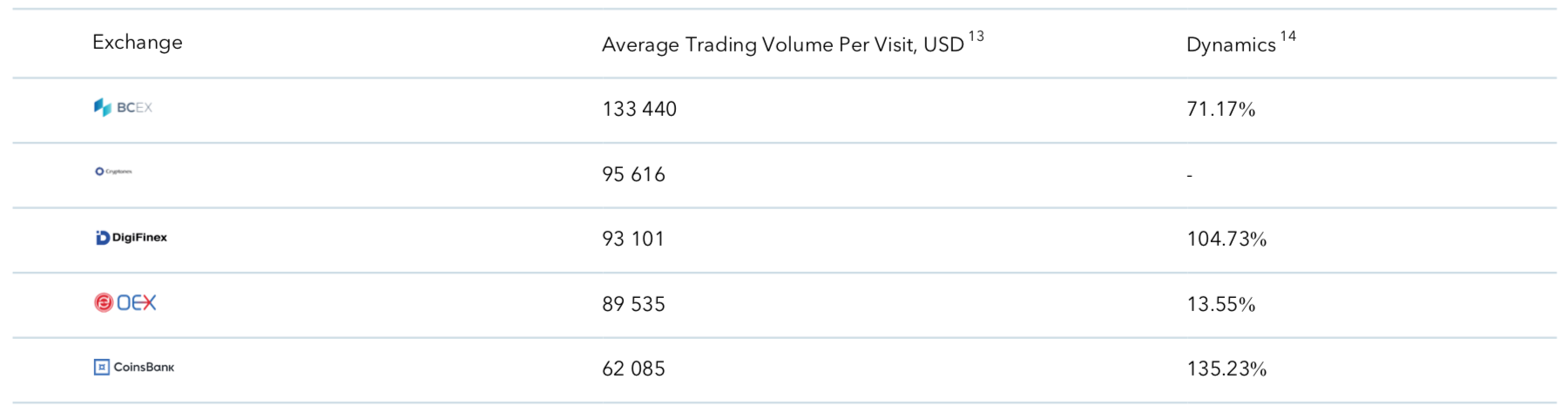 The leader in this category is BCEX, whose average trading volume per visitor is 133 440, USD (+71.17%), month to month period.