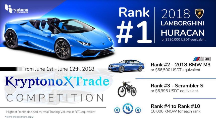 May 24, 2018 – To celebrate its official launch for public trading on June 1st 2018, cryptocurrency exchange Kryptono has announced that it will be holding a trading competition named XTrade. The top 10 traders with the highest trading volumes on the Kryptono Exchange between June 1st to June 12th 12:00 PM SGT (UTC+8) will receive attractive prizes based on their ranking.