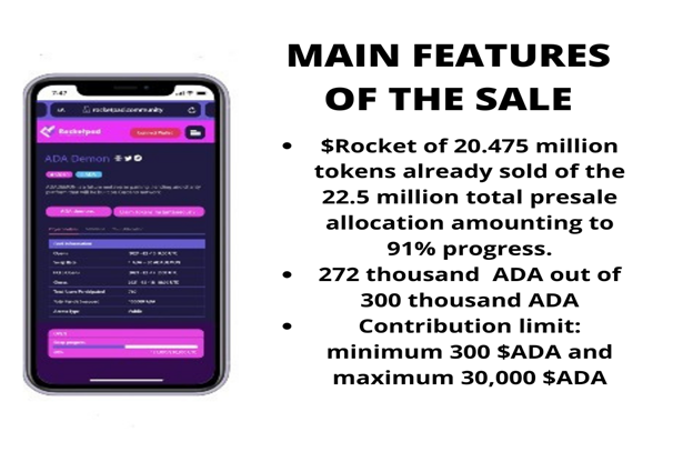 As of now, the sale is rapidly moving towards hitting the hard cap (ascertained at 22.5 million $ROCKET tokens equivalent to 300,000 $ADA at the price of 1 ADA = 75 $ROCKET).