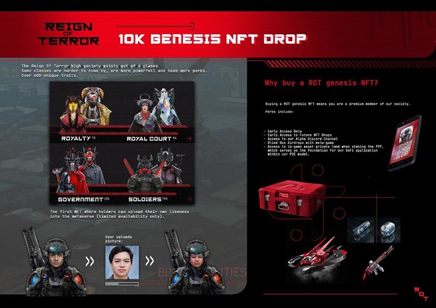 - Each NFT from the Genesis series can be used in the RoT Meta Pre-Game for staking quests that can net the holder special items used in Reign of Terror at launch (Q2 2022).