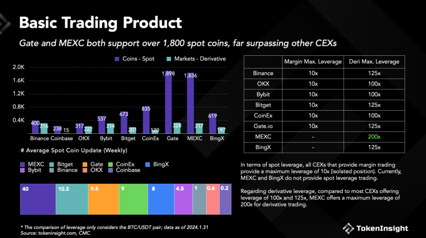 The report focuses on various trading products, including spot trading, derivative trading, strategy trading bots, and copy trading common to all CEXs. While spot trading products offered by major exchanges are relatively similar, there are notable differences in derivative trading.