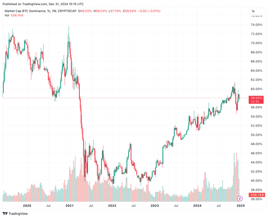The report adds that Bitcoin dominance (BTC.D) – a metric used to gauge the proportion of the total crypto market cap commanded by BTC – is expected to tumble to as low as 45% from its current level.