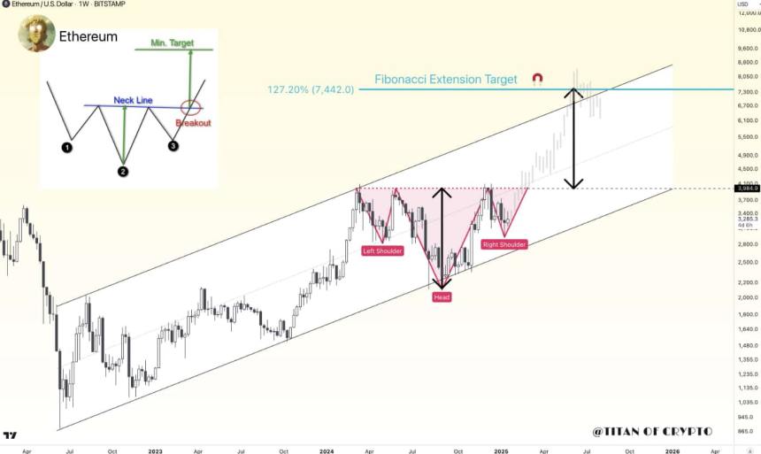 Secondo un’analisi di Titan of Crypto, Ethereum sembra formare un possibile modello di Testa e Spalle Inverso all’interno di un canale ascendente. L’obiettivo si posiziona così a $7.400.