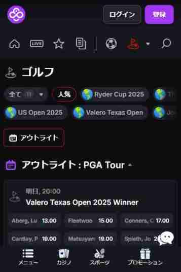 特に、松山英樹選手をはじめとする日本人ゴルファーが出場する大会のアウトライト(優勝予想)や上位フィニッシュ予想など、「日本人選手を応援しながらベットしたい」層にとって使いやすい構成です。