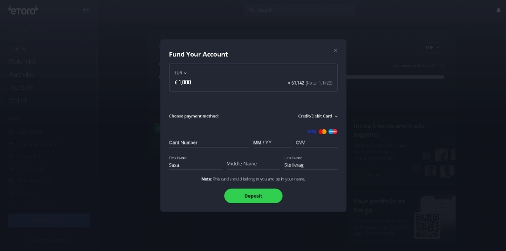 После успешной регистрации следует внести депозит. eToro предлагает разные способы пополнения счета, такие как банковская карта или PayPal.