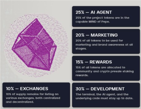 - Tokenomics: Total supply: 100,000,101,001, AI Agent: 25%, Marketing: 20%, Rewards: 15%, Development: 30%, Exchanges: 10%